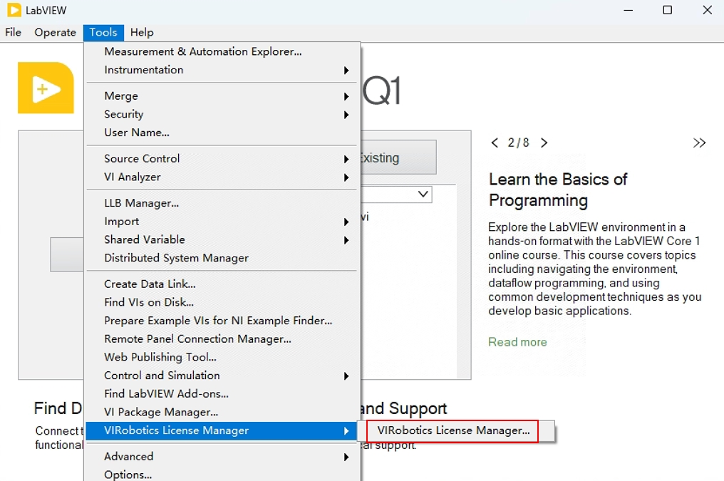 Tools -> VIRobotics License Manager -> VIRobotics License Manager