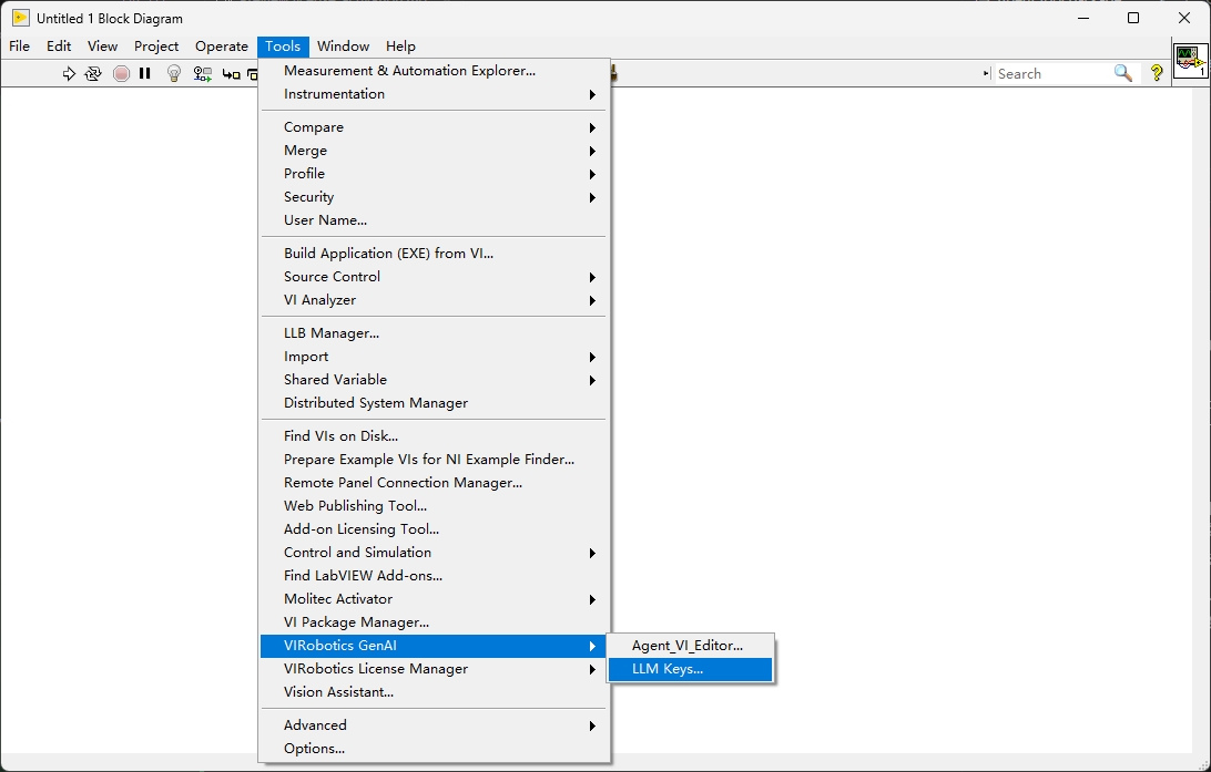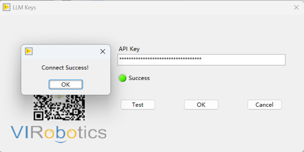 First run basic chat example basic.vi, then run complete examples (context/streaming/tool calling)
