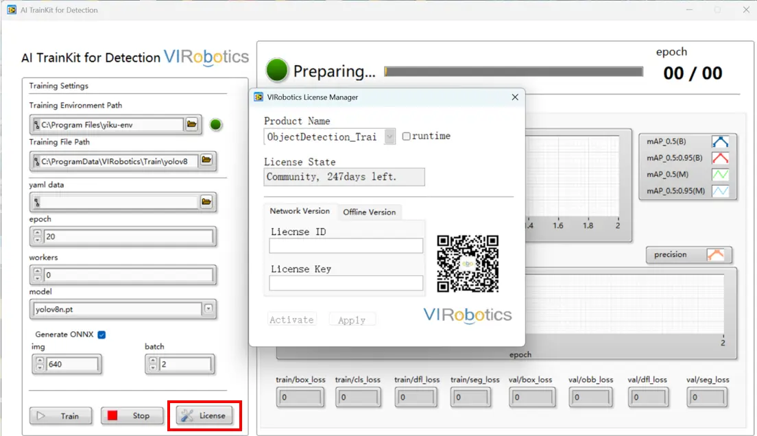 打开AI TrainKit for DetectionV1.1,点击License。Product Name中输入opencv_dnn,输入License ID和License Key,并点击“Activate”激活开发许可,弹出“Activate successfully”字眼即激活成功;