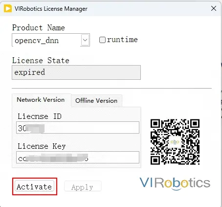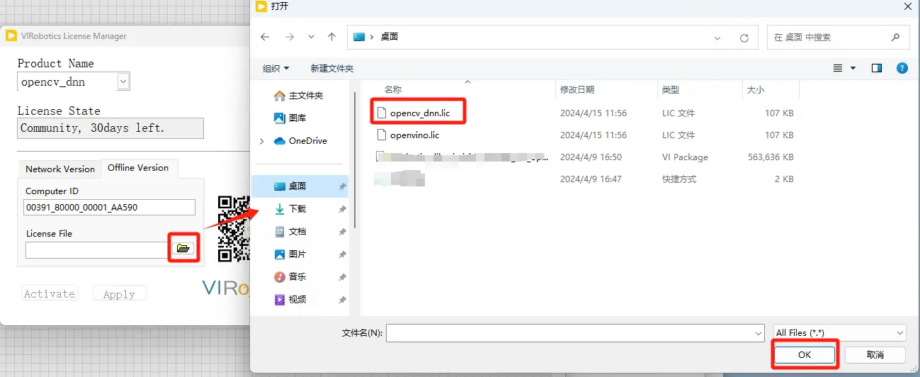 Product Name中输入opencv_dnn,Offline Version—文件按钮--选择对应的.lic文件—点击OK,点击“Activate”即可成功激活, 激活成功后,可以看到License State 为“Offline Perament Version”
