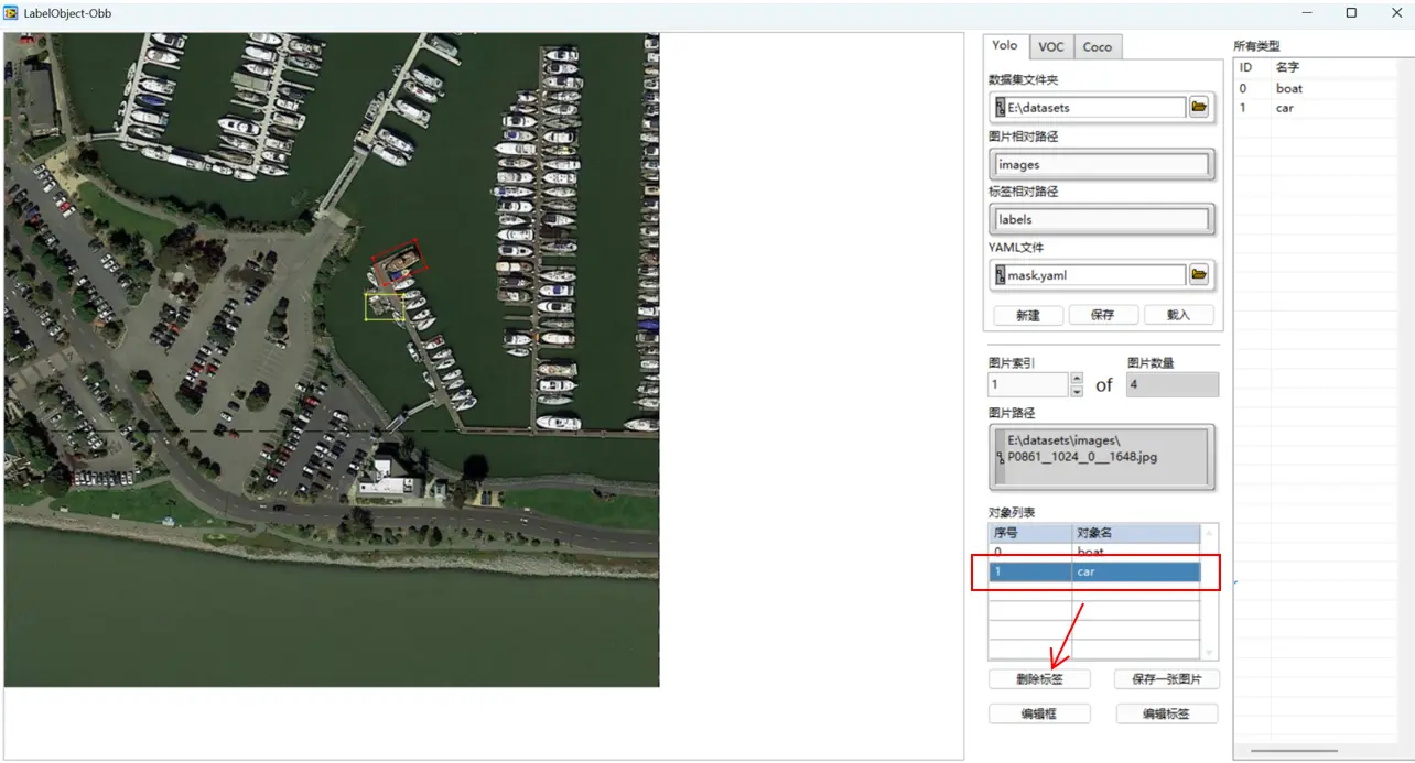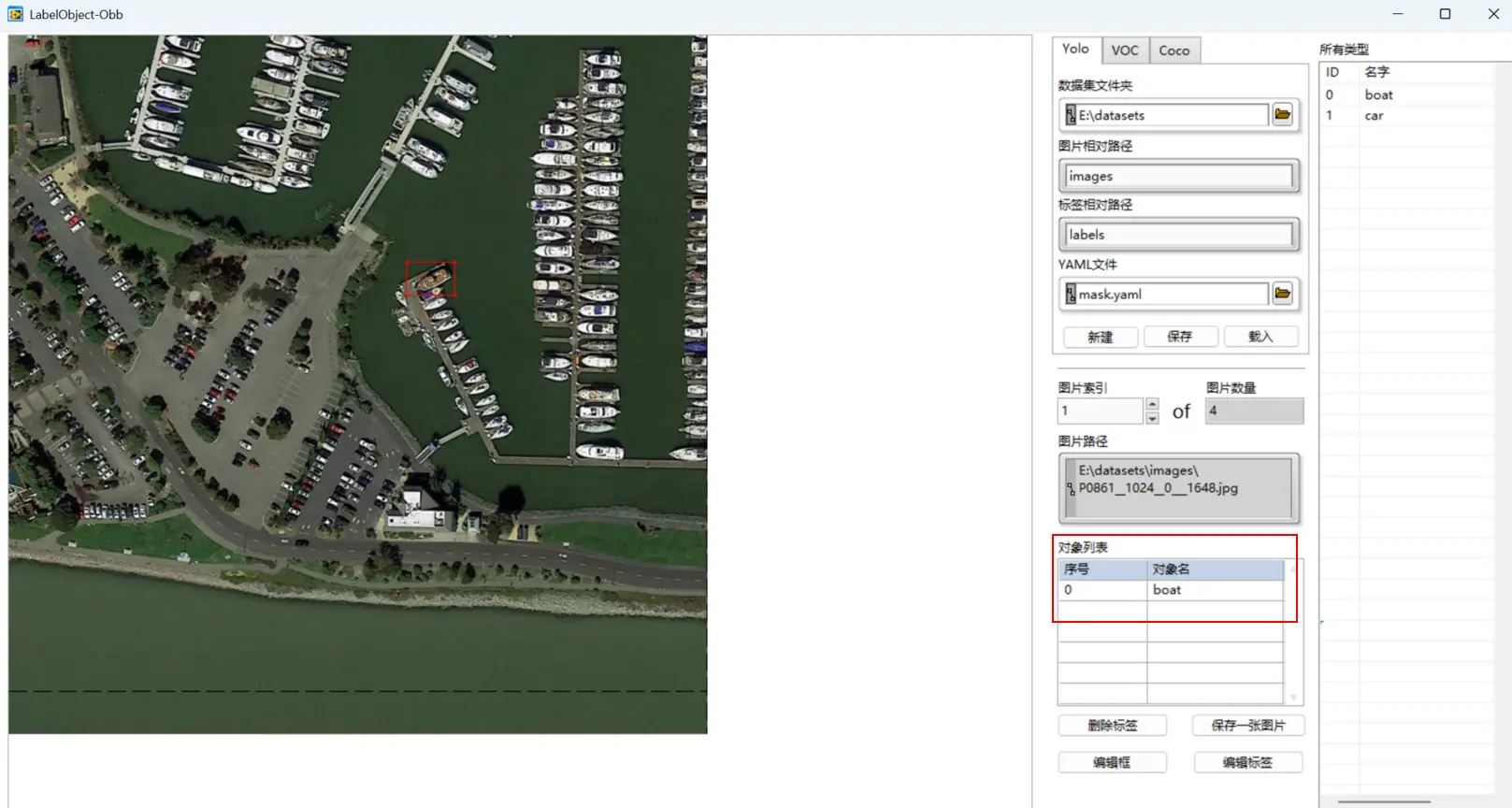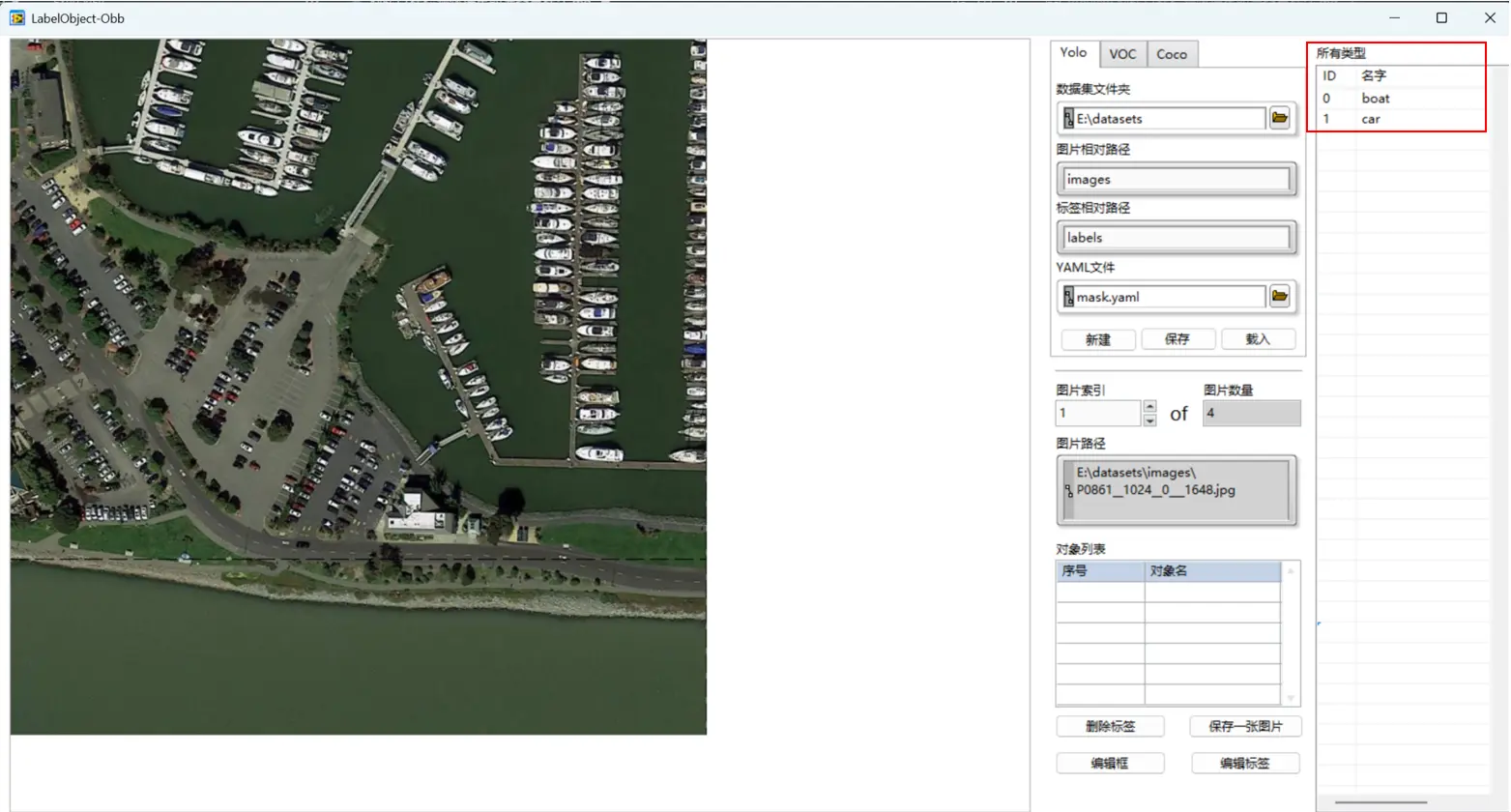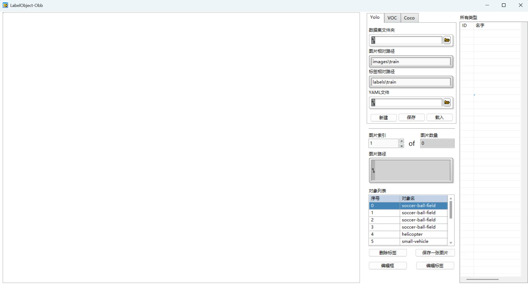 右边一栏“所有类型”当前什么也没有,可以自己编辑,但ID必须从0开始,逐个加1,标签名字必须是英文(如obb目标检测共两个标签,boat和car),添加所有要标记的标签;