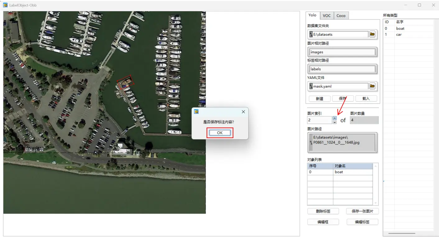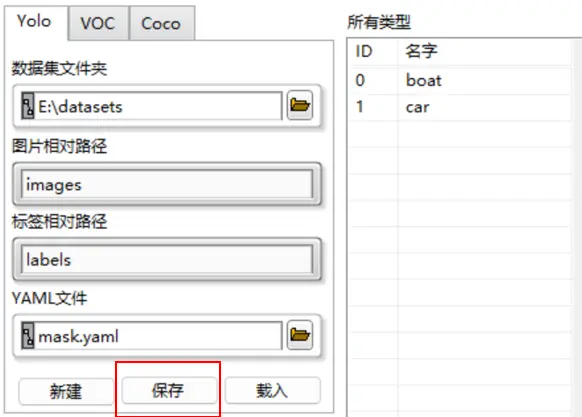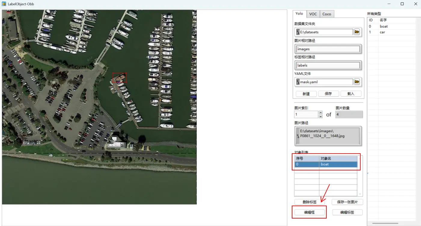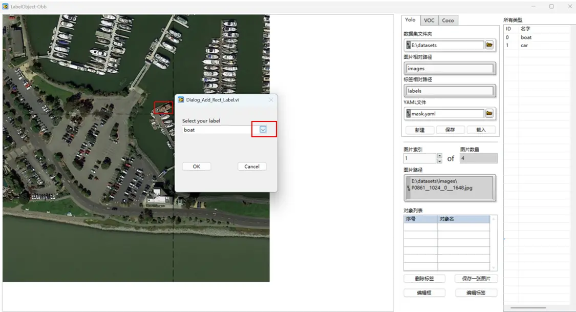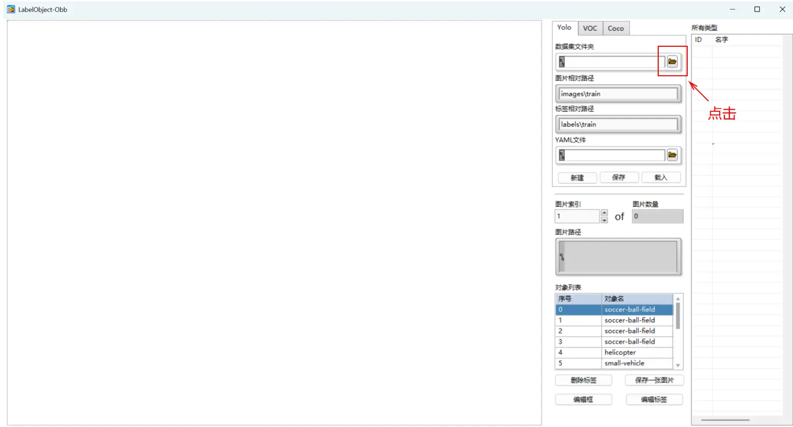 右边一栏“所有类型”当前什么也没有,可以自己编辑,但ID必须从0开始,逐个加1,标签名字必须是英文(如obb目标检测共两个标签,boat和car),添加所有要标记的标签;